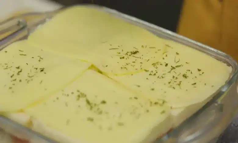 Cubra com uma camada de requeijão, queijo prato ralado, o presunto fatiado e o queijo muçarela fatiado.